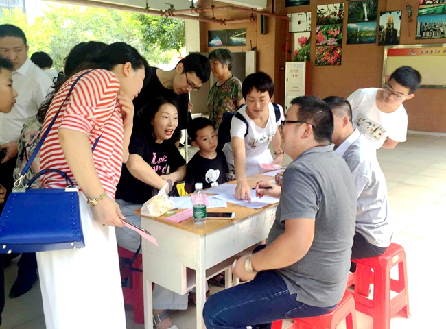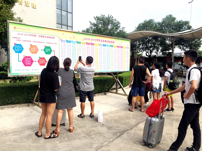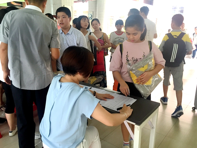 老师向到校报到的学生展露出温暖真挚的笑脸,为忐忑不安的初一学子加油打气,并就开学阶段的系列校园活动作详细地讲解,帮助学生尽快熟悉这里的一切。