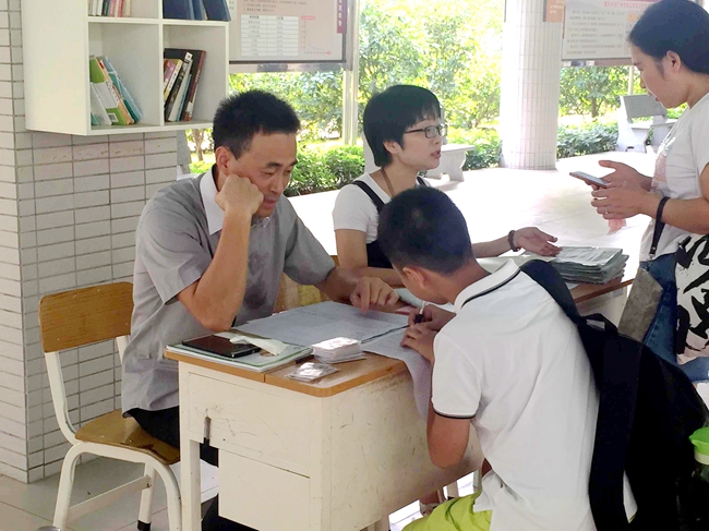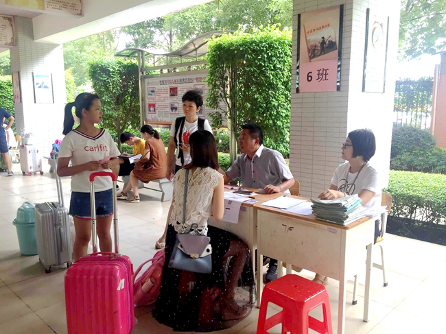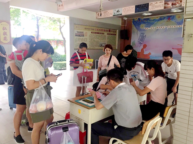 在教学楼架空层下,各班级早已有班主任及相关老师驻守等候,第一时间为远道而来的学生和家长送上亲切的问候。