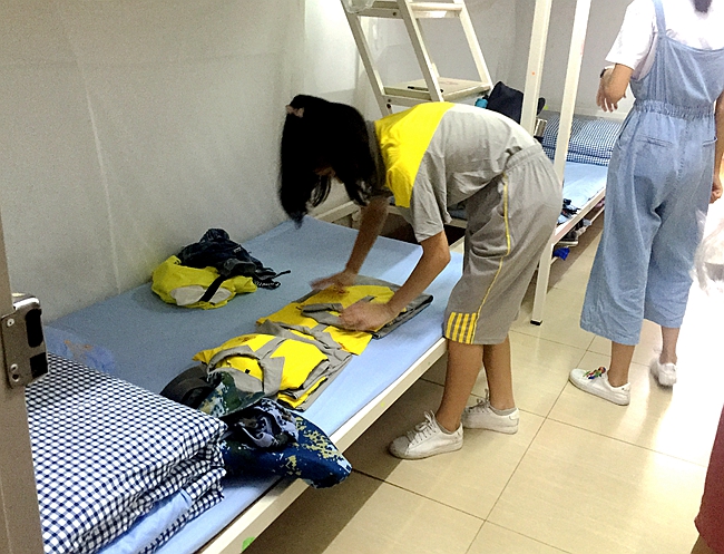 学生按照生活老师的示范指导,小心翼翼地埋头整理着个人的衣物,虽然手法稍显生疏,但经过往后数年的生活锻炼必能呈现全面的提升飞跃。