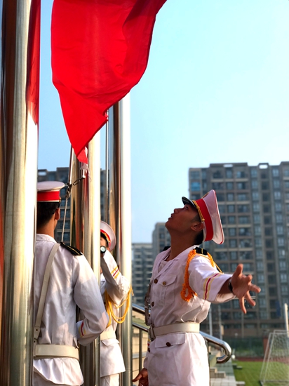 护旗小队迈着标准的正步进入师生视线,与师生们共同见证2018-2019学年第一学期第一面五星红旗在黄广学园的天空中骄傲怒放的瞬间。