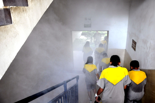 “哔!哔!哔!”三声哨响穿透校园,经专人监控制造的滚滚浓烟迅速弥漫校区楼道。