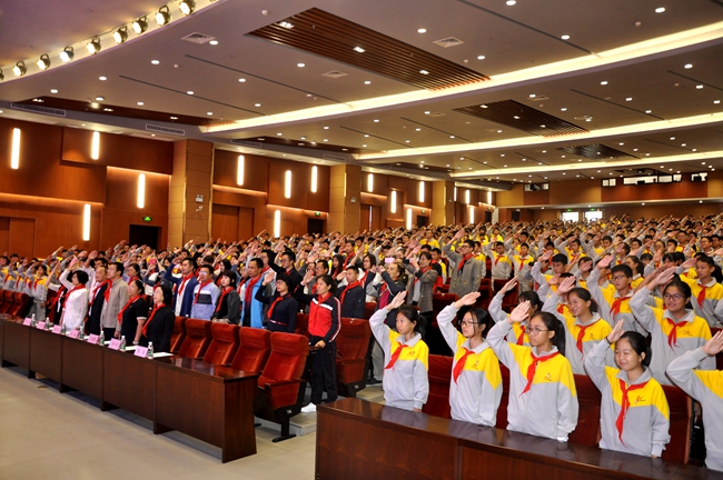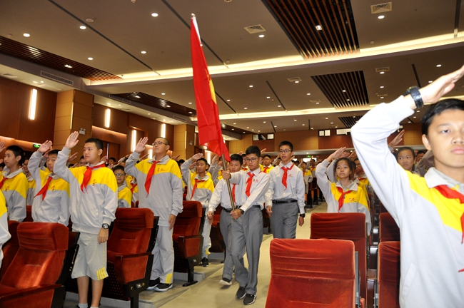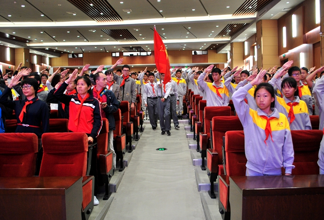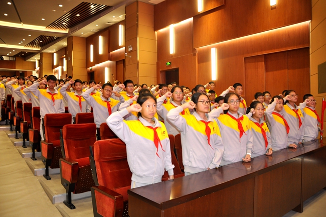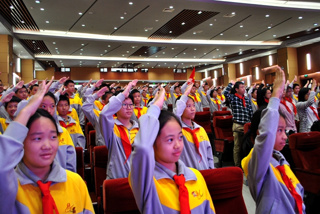 在花都区教育局创文办主任、区少先队总辅导员许卫珍老师的带领下,先锋少年们青春无畏的声音响彻礼堂。