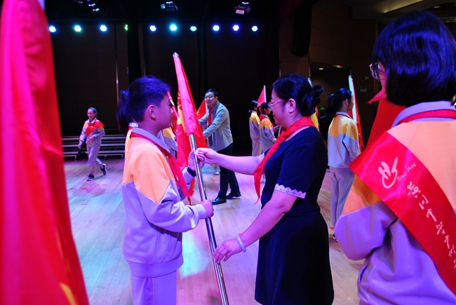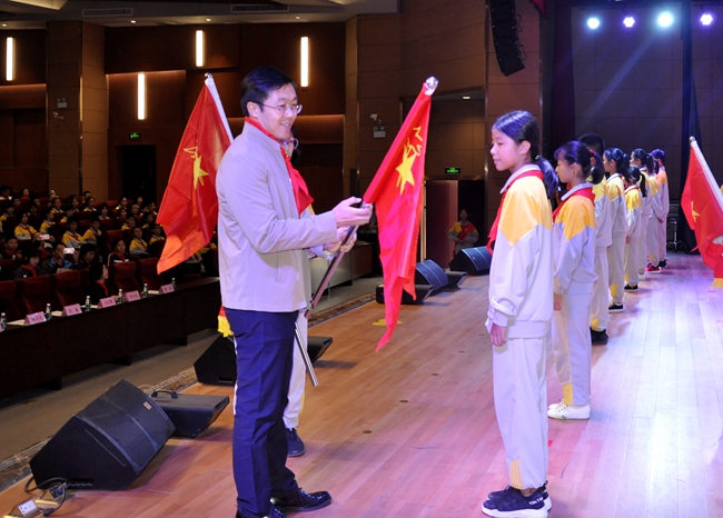 吴晟书记、王红霞主任向黄广学校七年级新建中队授予鲜红队旗,将其中承载着的精神与期盼、使命与未来的队旗郑重地交到每位优秀学生代表手中。