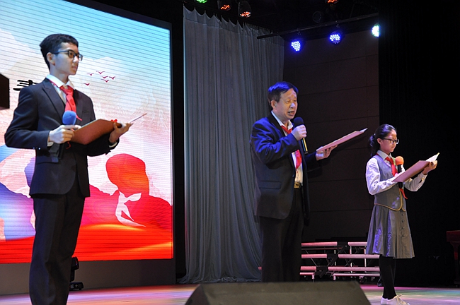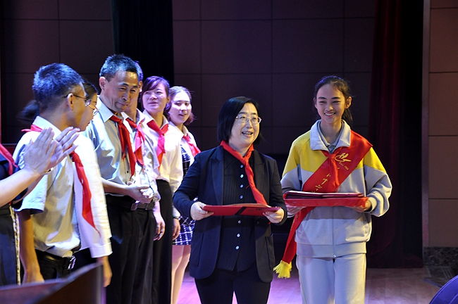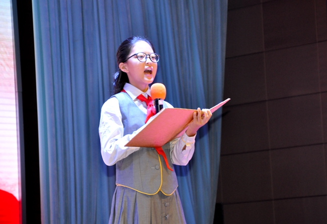 学校党员代表张连清老师、团员代表侯宇同学以及少先队员代表韩佳凝同学,特意在建队仪式上向祖国母亲献词,饱含真挚的诵读显露出中华少年的阳光向上、展现共青团员的壮志凌云、表达着国家党员的满怀豪情——“我们的血脉涌动着忠诚的信念,我们的心房回旋着真的节律,我们的喉咙喷涌着滚烫的语言,我爱你,中国!”