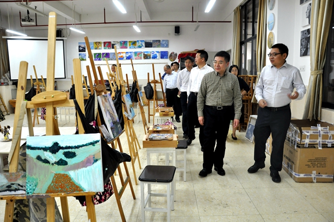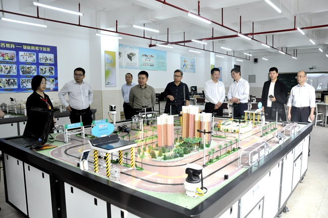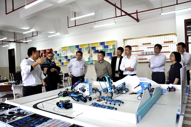 游烈峰校董带领陈继平常委一行先后走进艺体楼、文化广场、创客教育基地、教育成果陈列馆等功能场馆,深入体验黄广学校研发的 “智慧教育”体系及各项实践载体。