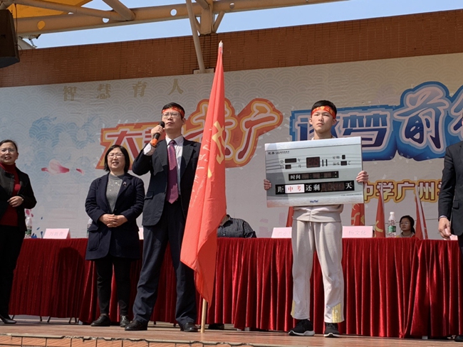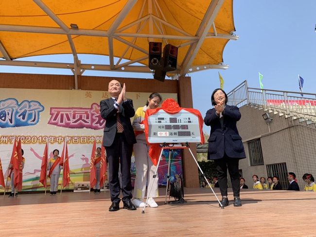 范小星校长联同杨文化副校长共同为百日计时器揭牌,宣告中考备考阶段正式进入最后的百天冲刺,并亲自向九年级各班主任及学生代表授予鲜红战旗、颁发计时器,向师生面对面表达鼓励、表示支持。