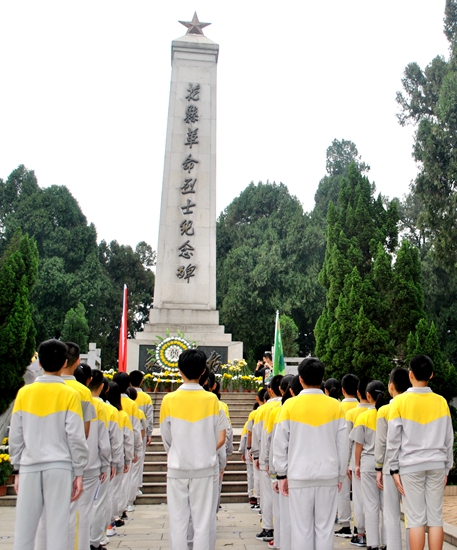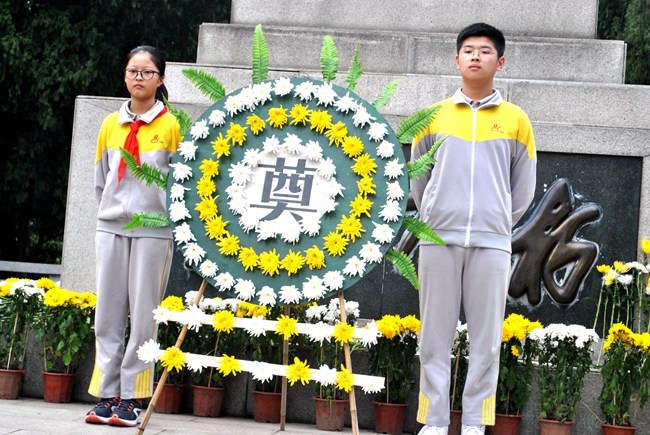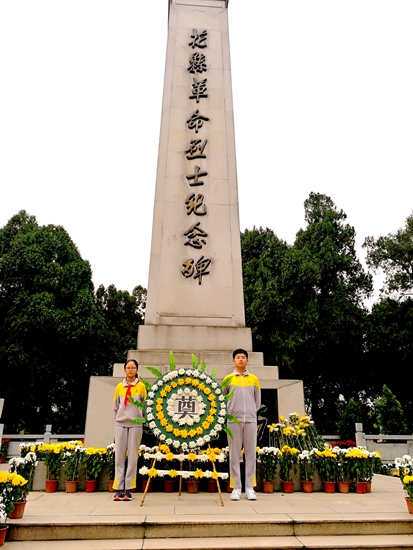 心怀敬意的黄广学子们自觉排列着整齐的队伍,迈着小心翼翼的步伐,逐步深入庄严而肃静的烈士陵园。面对挺拔而立、直刺云天的革命烈士纪念碑,学生们郑重地献上了精心编制的纯白花圈,这镶嵌其中的朵朵黄白菊花既象征烈士们崇高纯粹的理想信念,也寄托了学生们难以言表的深沉哀思及身为后辈的无限敬仰。