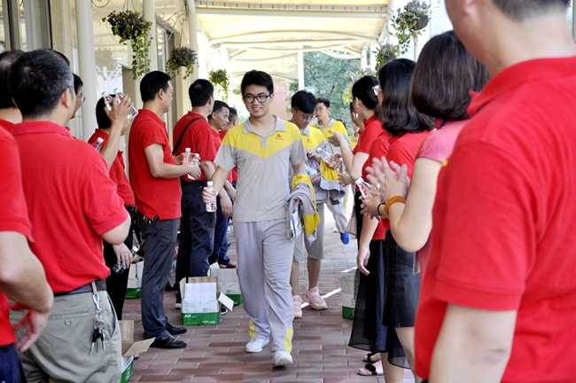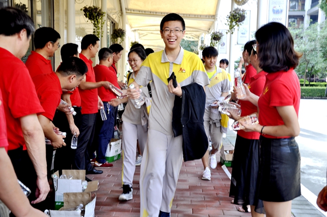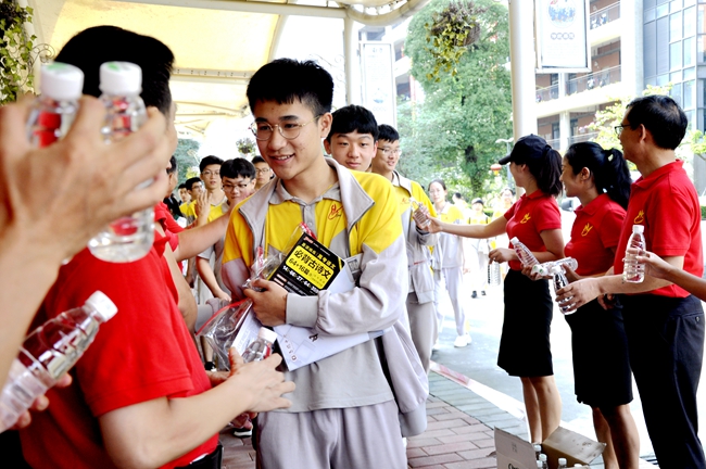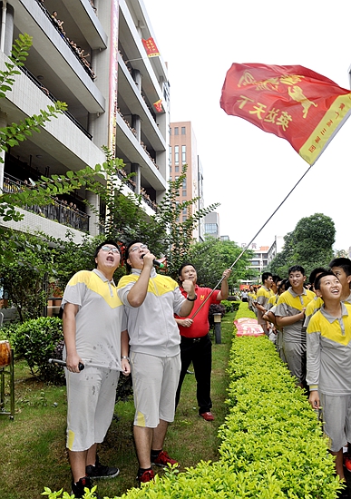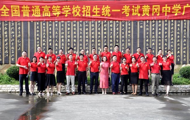 高三军团“主场”迎战,学生们整装待发,身着鲜红战服的学校老师自组“红衫战队”,与校领导一同为赶赴考场的黄广勇士送上祝福与鼓励。