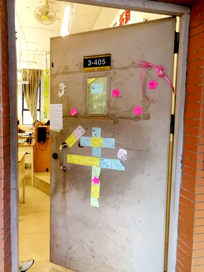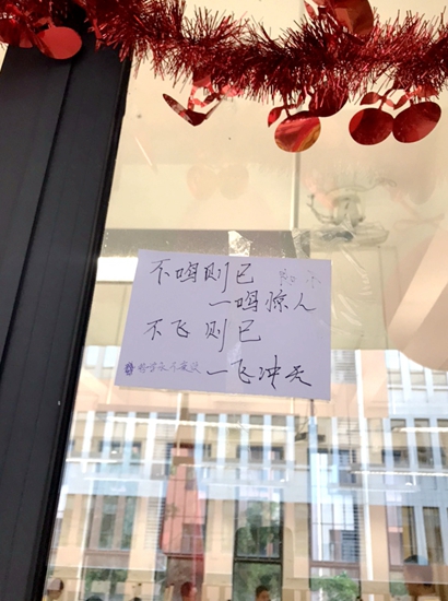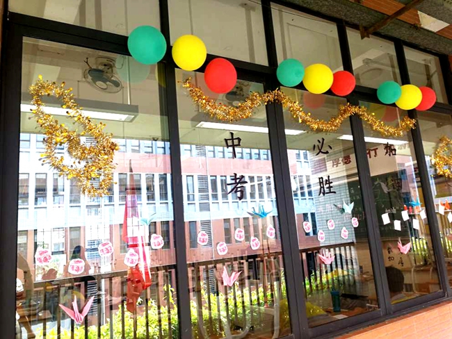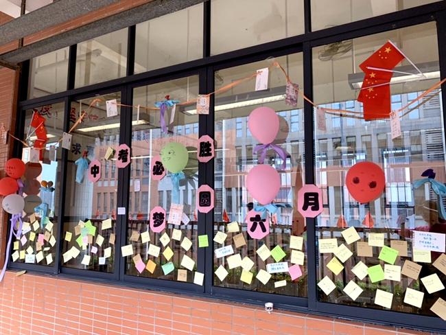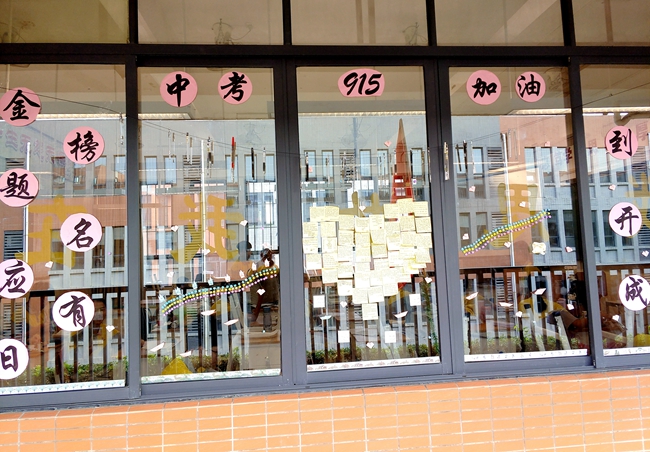门窗上,创意十足的精心图案排版,为埋首翻腾于知识题海的学子们带来新鲜的视觉享受,幽默轻松而不失诚恳的亲笔书写,向初三军团的斗士们输送着源源不断的精神动力、心灵养分。