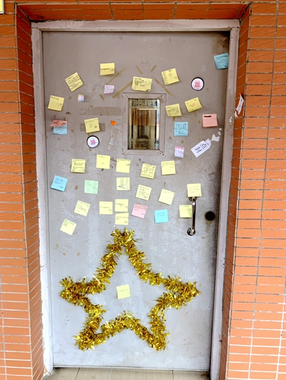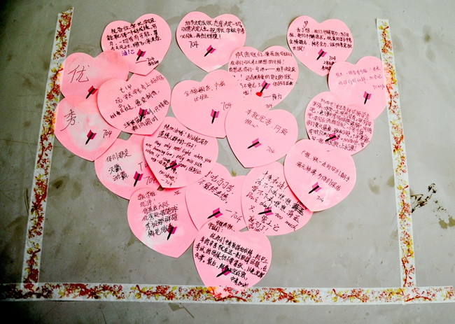 眼前,一张张形状各异的小纸贴拼写出温暖人心的简单祝福,一个个缤纷滚圆的小彩球打破了紧张弥漫的课堂氛围;