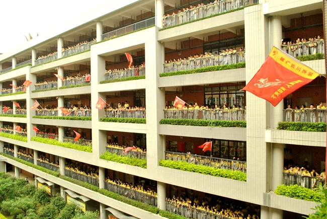 战鼓轰鸣,雄狮跃起,礼炮齐发,初一、初二全体师生共同汇聚,每班方阵在隆隆鼓吼的召集下迅速集结并包围初三大本营,为即将决战中考的初三军团发出声势浩大、激扬斗志的高呼呐喊。