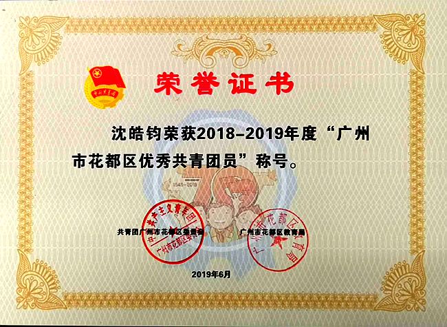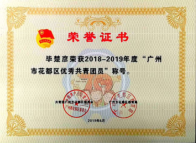 九(11)班毕楚彦和九(15)班沈皓钧同学被评为“2018-2019 年度广州市花都区优秀共青团员”;