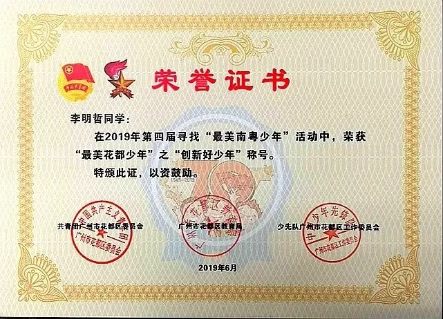 近日获悉,T5班李明哲同学在2019年第四届寻找“最美南粤少年”的评选活动中,获评为“最美花都少年”之“创新好少年”;