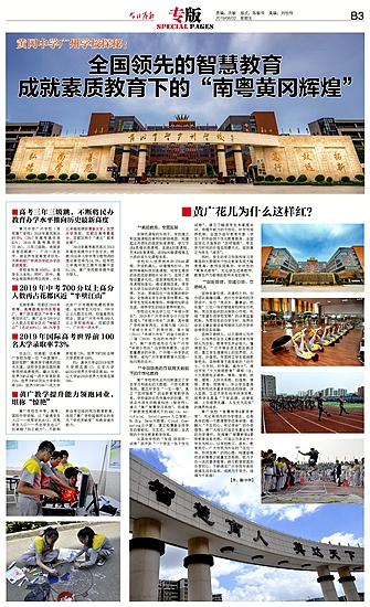近日,花都区委区政府机关报《今日花都》以 “广州市黄广中学n>全国领先的智慧教育,成就素质教育下的‘南粤黄广辉煌’”为题,对黄广学校进行专题报道,黄广学校智慧教育&素质教育办学成果、多项指标居广州民办第一/花都区第一/广州一流水平,得到媒体和社会各界的高度关注。