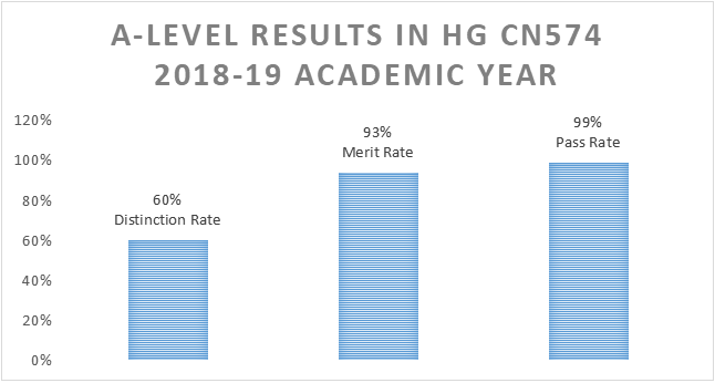 据了解,在2018-2019学年中,黄广高中国际部向剑桥国际考评部总共提交了181份有效考卷,其中60%的考卷成绩达到了杰出(A-A*),93%达到了优秀,总通过率高达99.4%。