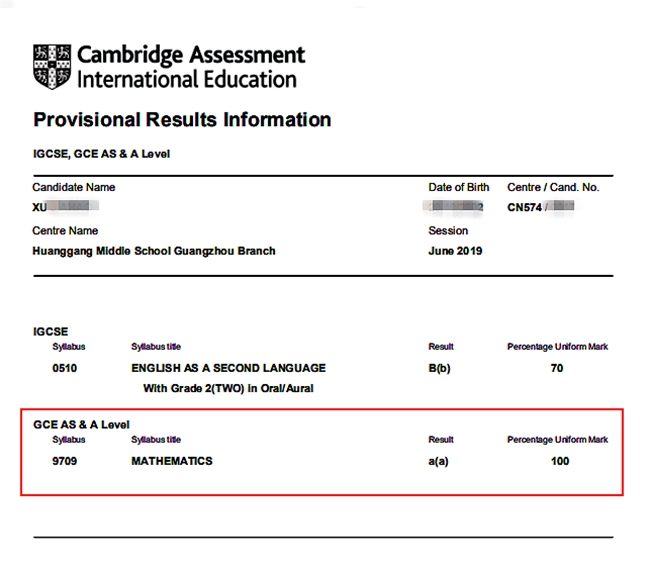高一许同学获得AS阶段Mathematics A* 100%满分的好成绩。