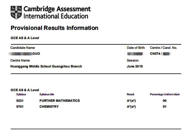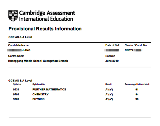 高二郭同学获得3科A*:91% A* Chemistry,90% A* Further Mathematics;