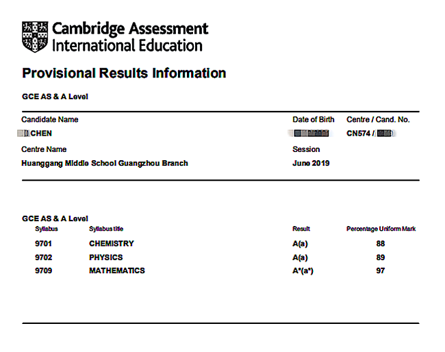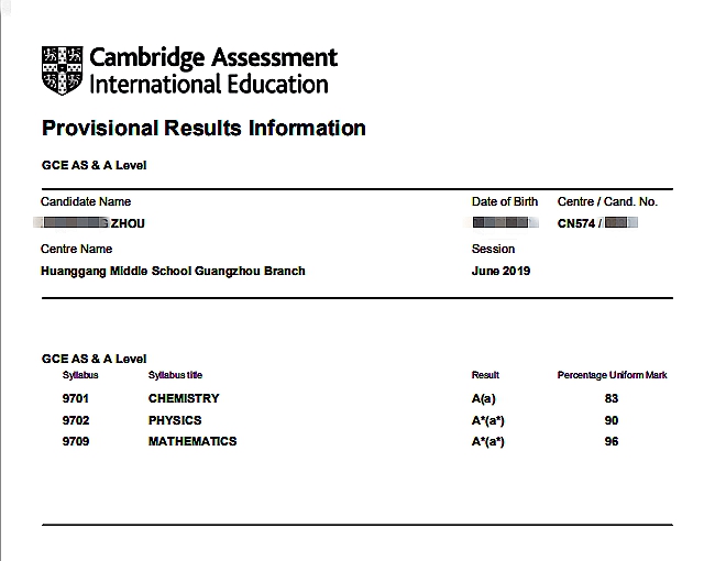 高二周同学获得2科A*1科A:96% A* Mathematics,90% A* Physics;