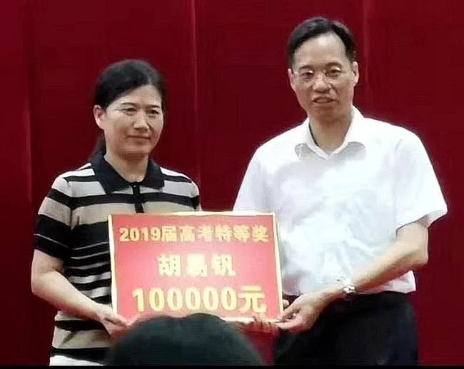 肖红梅老师代表已赴清华的胡易钒同学,接受由叶志良区长亲自颁授的奖励。