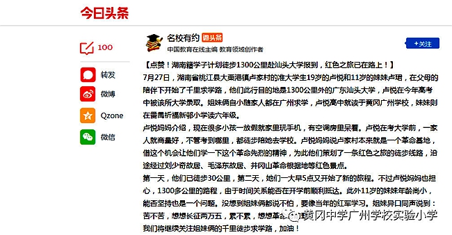 【今日头条】黄广精神:学子计划徒步1300公里赴汕头大学报到,红色之旅已在路上!