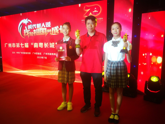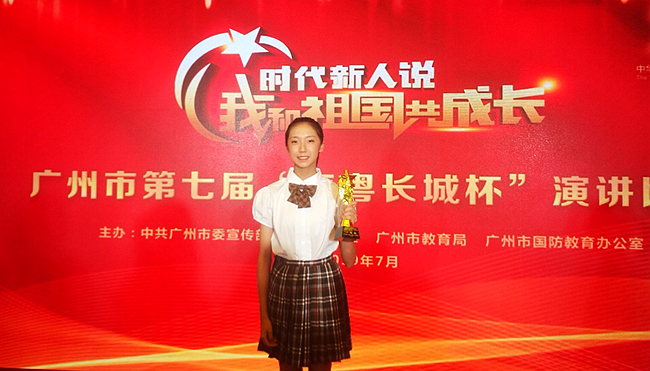 近日获悉:在2019年7月于广州市隆重举办的第七届“南粤长城杯”演讲比赛中,广州市黄广中学七年级(7)班唐歆恬以出色的实力发挥脱颖而出,荣获初中组一等奖。