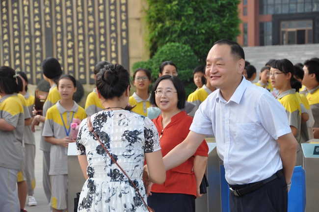 清晨六点半,一众学生代表在范小星校长、孙传华副校长、杨文化副校长的带领下,率先等候于学校大门处,只为向陆续赶赴学校的老师们送上节日的第一份贺礼。