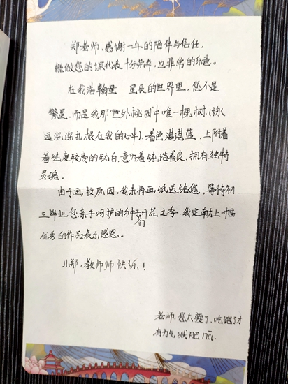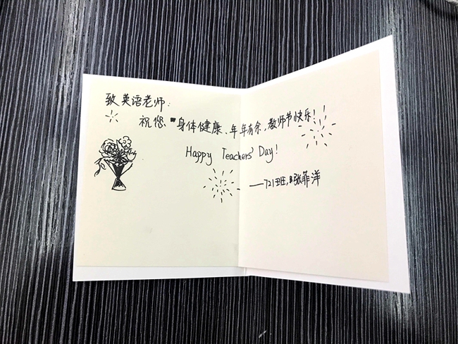 感谢老师们在学习征程上的用心指引,感谢老师们在成长路途上的真心陪伴,一封封彰显个性的手写信、一张张设计别致的手工贺卡以及让人眼前一亮的祝福主题板报,同学们将久久珍藏在心底的感激之情化作笔头下的一字一句。