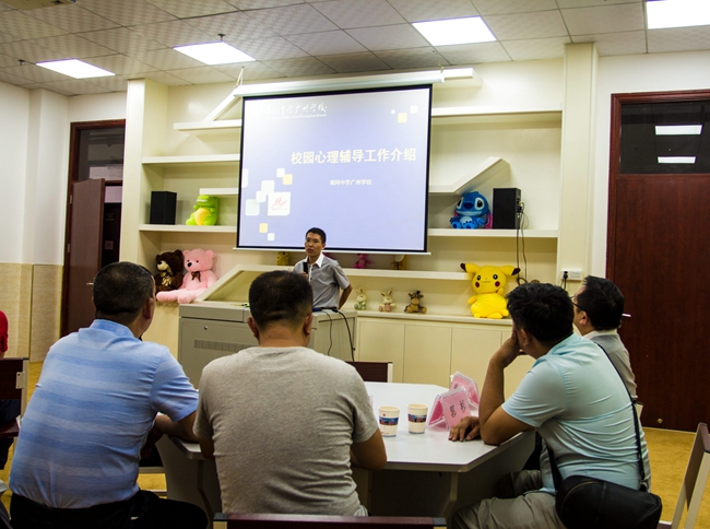图中,学校心理健康指导中心马海军主任为李勤龙副校长等来宾“特别开课”,就黄广学校的心理健康保障机制进行解构性介绍。