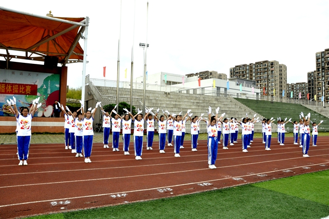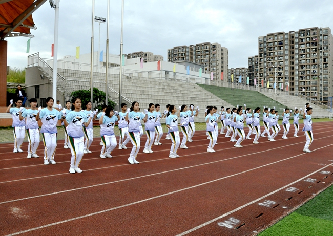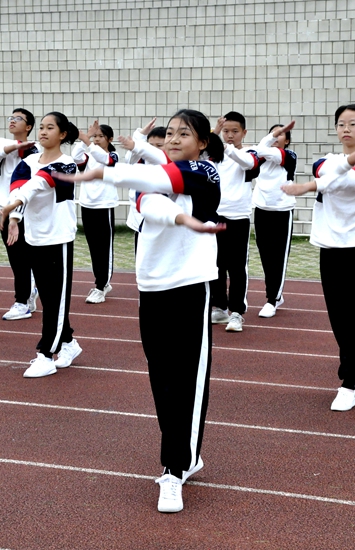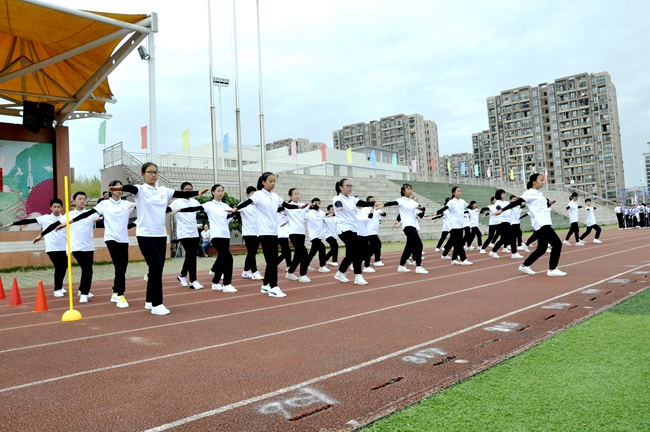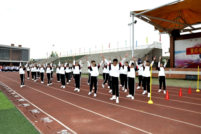 踏步、伸展,弓步、弹跳,赛场上的黄广学子与时而优雅舒缓、时而轻快欢乐的广播操音乐形成了强而有力的“默契”,跟随动静相融的旋律口号,配合快慢变幻的节拍指令,同学们用肢体完美诠释每一套指定动作: