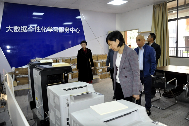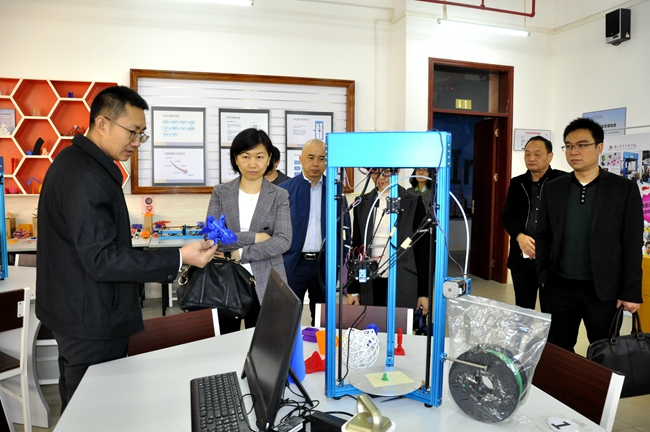 黄广教育集团梁润佳董事长、学校杨文化副校长等陪同来访领导,先后走进陶艺实践专用室、创客教育实践基地(3D打印及建模、物联网、智能机器人等)、黄广大数据个性化学习服务(智学)中心等,就黄广学校智慧教育发展、智慧育人成果等作现场介绍。
