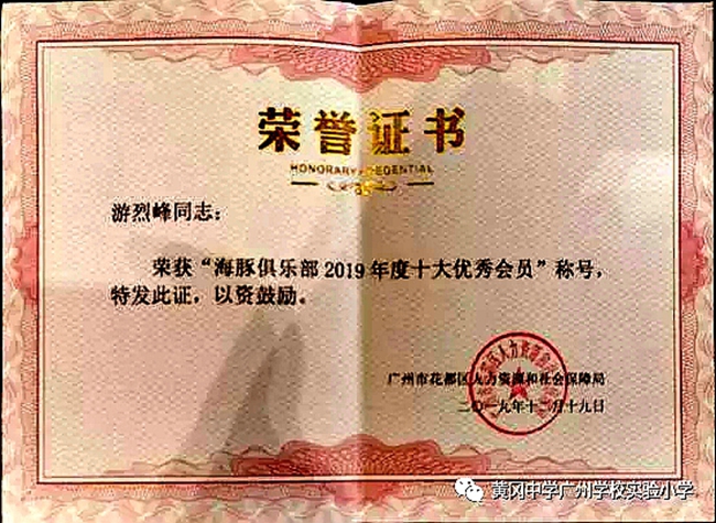 12月19日,花都区人力资源社会保障局对广州花都海豚俱乐部2019年度表现突出的十大优秀会员进行公开表彰。