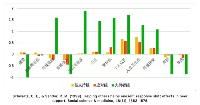 实验结果发现:在生活满意度、自主掌控感、个人成长、人生目的感、自我接受等方面,第二组支持者的表现都比被支持者和应对组好出很多,他们通过支持别人,对自己产生更高的自信与期望,人生更有目标,从助人中感受到更高的价值感、幸福感、充实感;在责怪他人、抑郁、焦虑等方面,三组实验者都呈现出可喜的变化,得分均是负数,但是支持者的负数值比其他两组更大,说明他们更少责备别人,也更少表现出抑郁和焦虑。