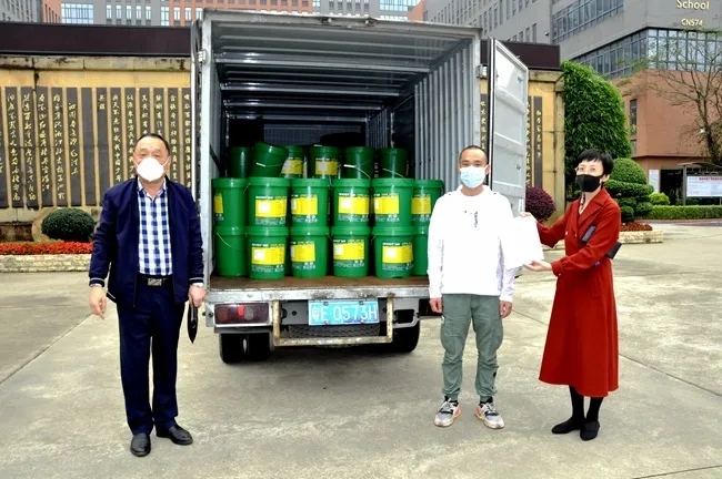 七(22)班陈舒洁同学家长特意向学校捐赠消毒液250千克(共10桶,每桶25千克)。