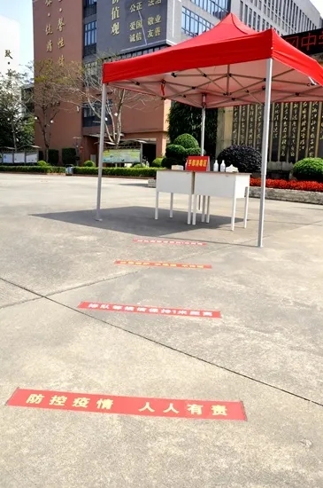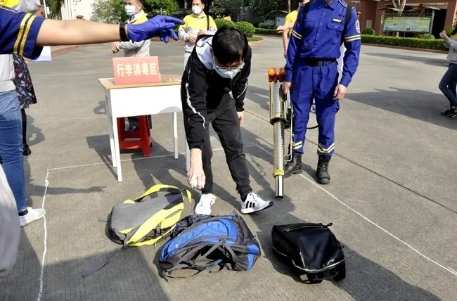 各年级“学生”(由老师进行角色扮演参与模拟)抵达学校,必须在校门口按照间距标线耐心等待,在保证维持“不扎堆,不拥挤”的1米安全距离中有序通过一道道“进校关卡”——检查口罩佩戴、额温枪测温、红外测温仪测温、学生手部消杀、行李消杀、进校登记。
