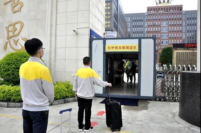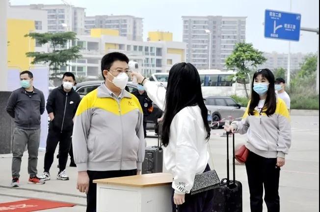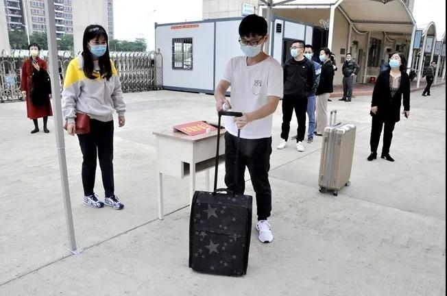额温枪测温+行李消毒+手部消毒,流程明确的重重关卡,分批到校的学生抵达入校也可根据指引保持秩序。