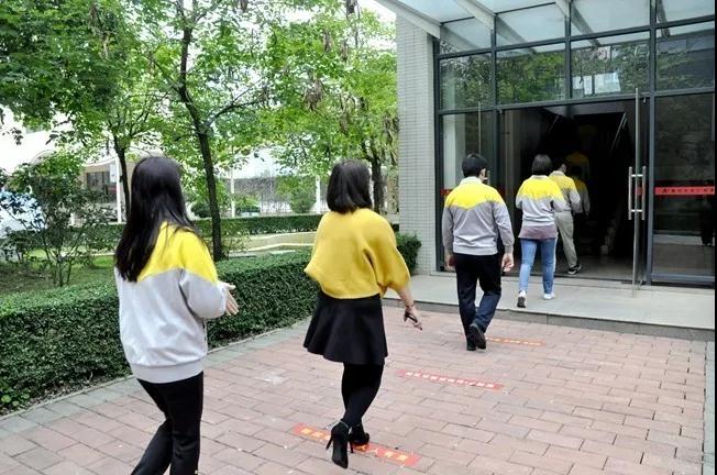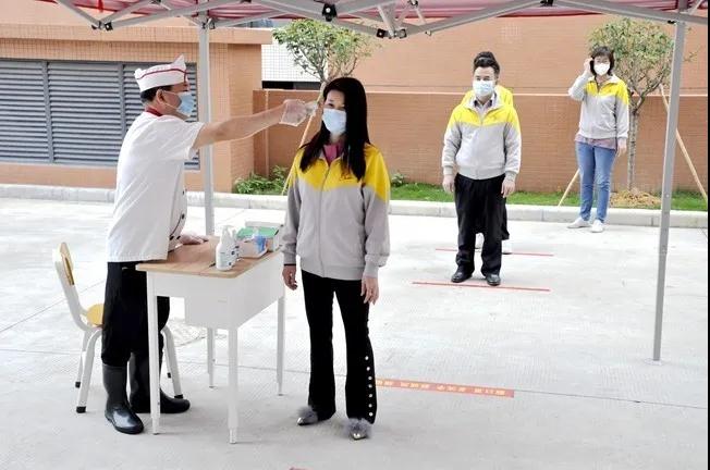 进教室前必须先测温消毒,保持队形并耐心等候是“防疫铁律”,更能体现学生素质。