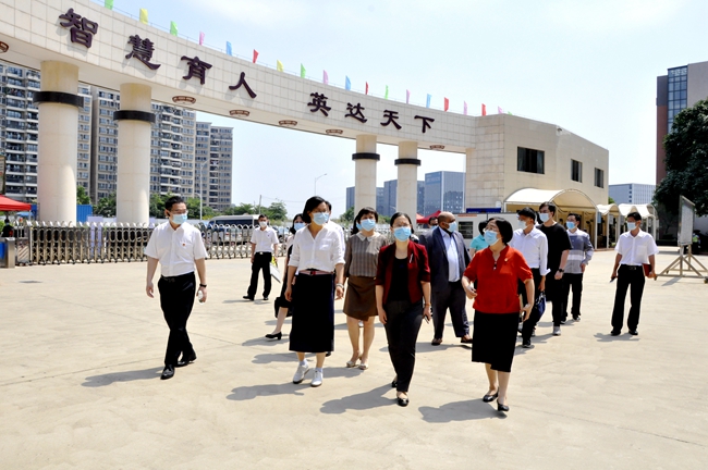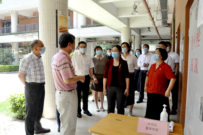 继近日花都区人大常委会郭共添主任、区委李波常委、区政府蒋福金副区长等相继到广州市黄广中学校)考察指导返校疫情防控工作后,5月3日上午,广州市教育局陈爽局长、花都区政府邢翔区长率团莅临黄广学校,调研指导学校返校疫情防控工作。广州市教育局市管一级调研员陈跃红、花都区教育局长胡标发、广州市教育局副主任督学赵立宇、广州市教育局办公室副主任刘贝铌和花都区相关部门负责人等一同考察。