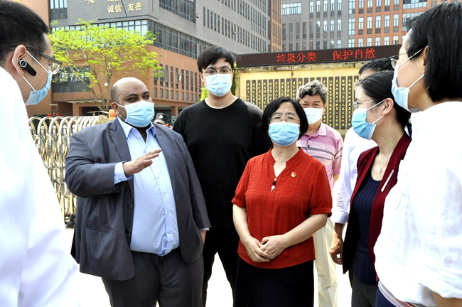 陈爽局长特别关心孩子的心理健康,详细了解学校心理健康教育方面的措施,就学生返校复学后如何保障心理健康等进行了指导;同时,还特别与黄广学校负责国际教育的外方校长IMRAN ALI-FARZAL先生进行了交流,向黄广外籍教师团队表示慰问。