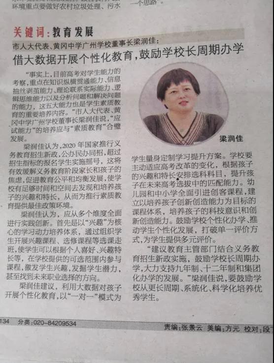 广州两会期间,广州电视台、南方都市报、今日头条、新快报、信息时报等媒体纷纷报道广州市人大代表、黄广中学广州教育集团梁润佳董事长基于黄广办学经验的系列建议: