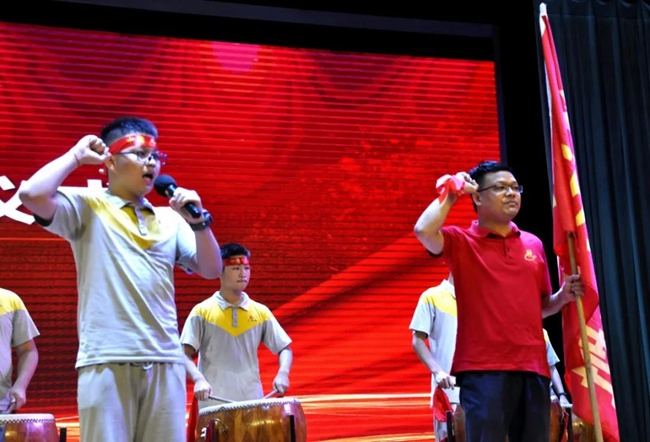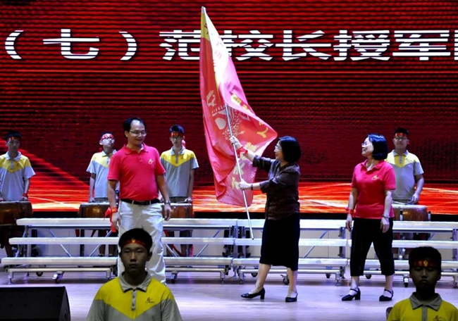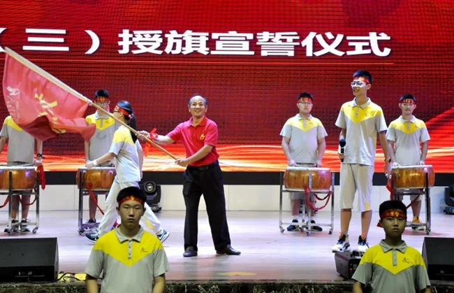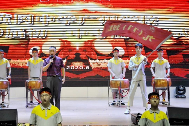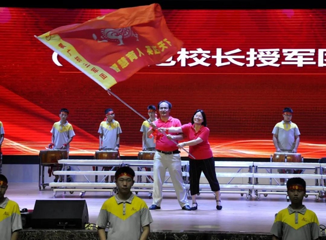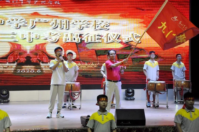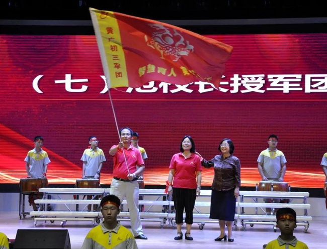 范小星校长代表董事会,向初三年级授予军团战旗。这已是黄广学校中考誓师的一项传统,今年由刘清华、殷玉莲两位主任共同承接使命。