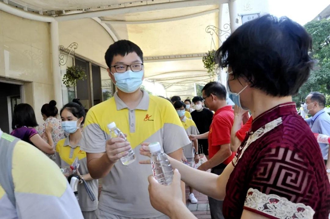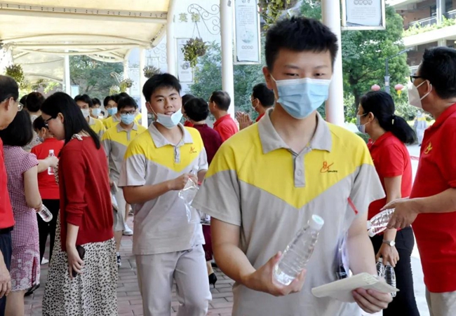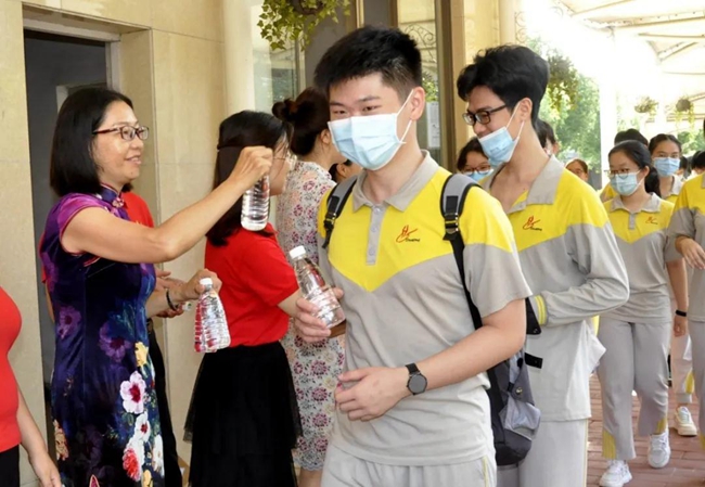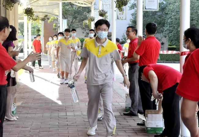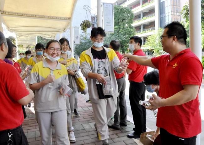 身着鲜红战服或旗袍加身的高三老师专门共组“送考战队”,等候在考场的必经之道,与学校领导特别延续“送水击掌”的振奋士气传统,向迈步考场的黄广勇士们送上祝福与鼓励,正式进入“战斗状态”的高三勇士们,在声声祝福、阵阵欢呼中朝着理想战场踏出坚毅的步伐。