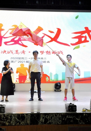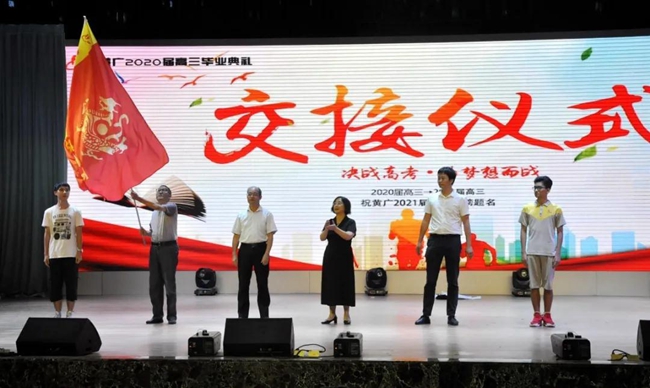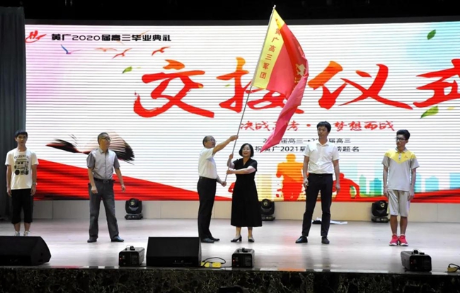 2020届高三年级在现场全体师生的注视下,经范小星校长与孙传华副校长传递,将象征使命的烈火战旗交给了2021届高三年级师生代表。