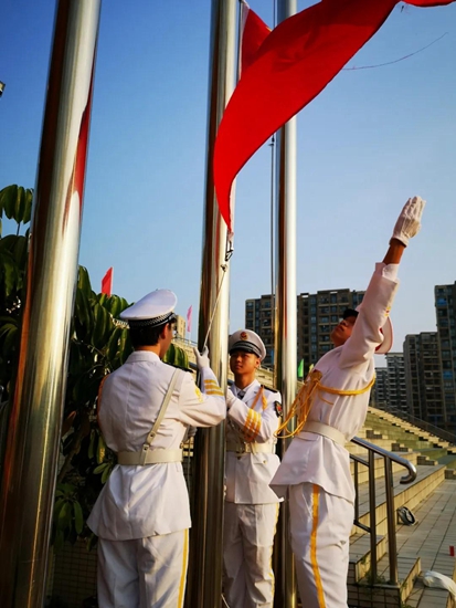 在护旗手队伍的护送下,在全体师生的注目中,冉冉上升的“闪烁星火”在蔚蓝苍穹中奋力绽放出如炬燃烧的生命力——五星红旗在黄广校园的宽广蓝天中展姿飞扬。