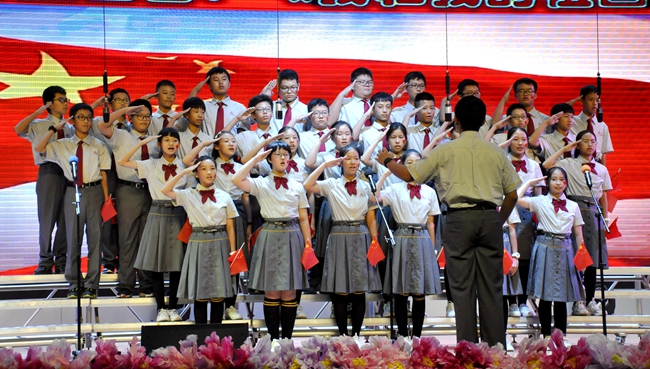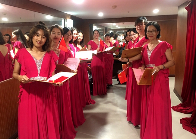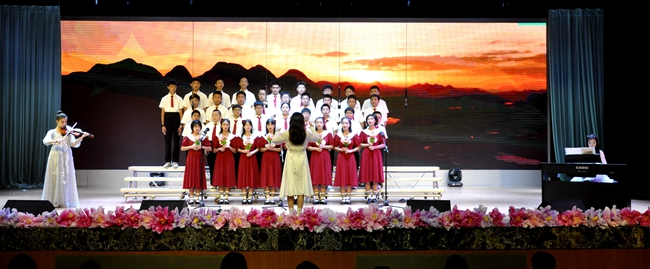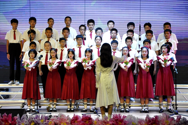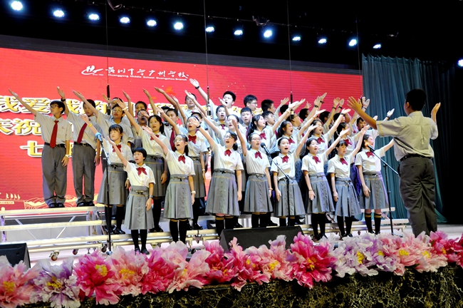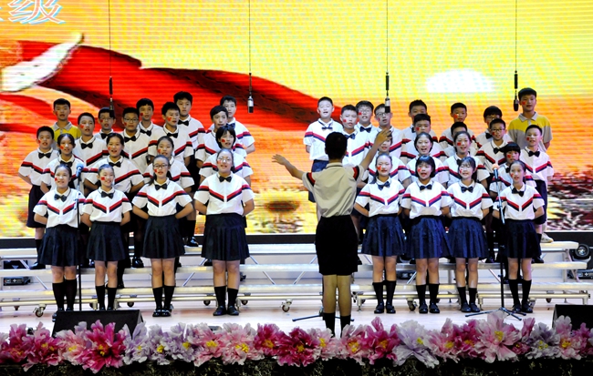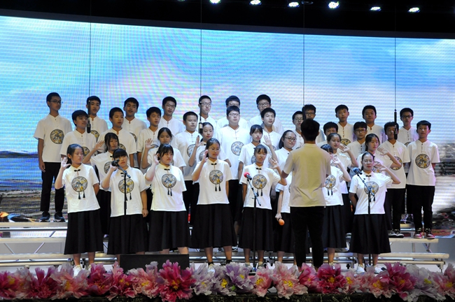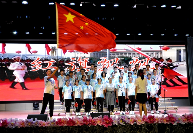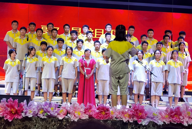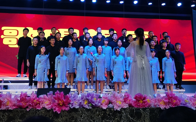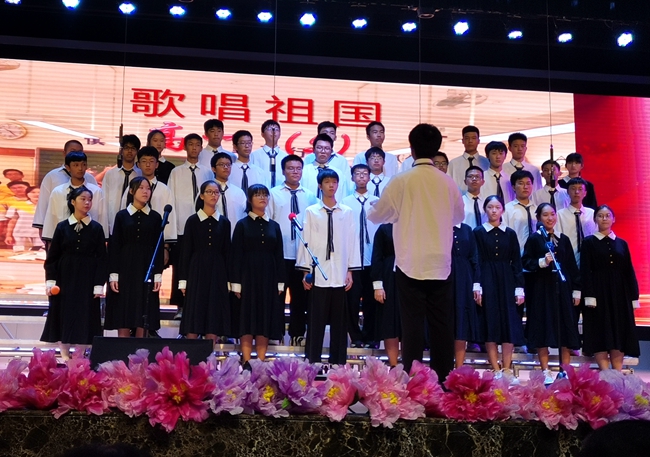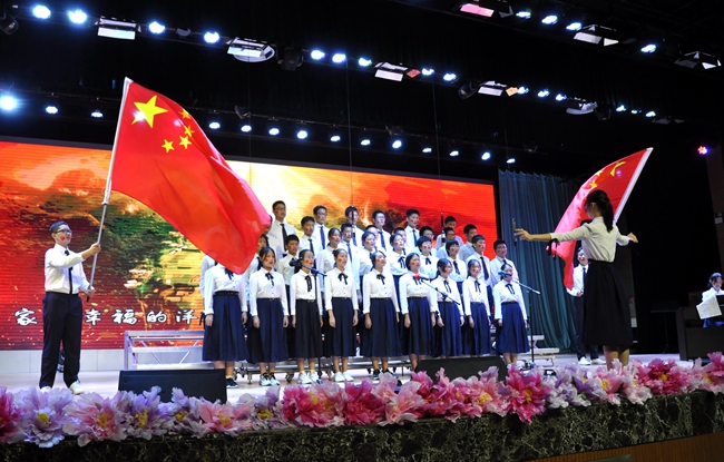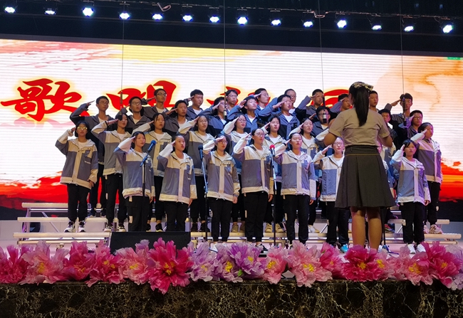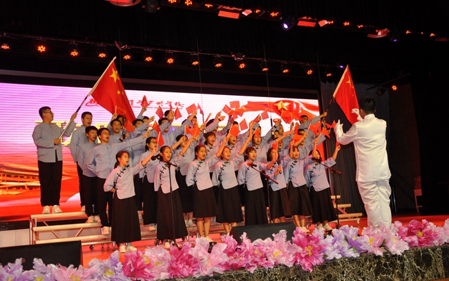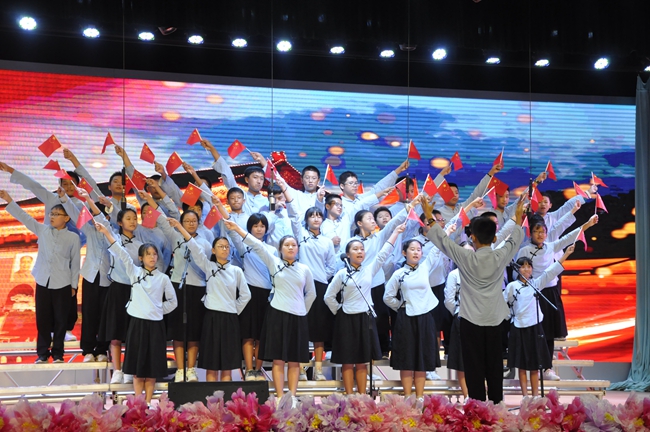舞台上,师生歌唱家们以歌抒怀,热血沸腾的高唱与张扬飞舞的旗帜交织出的震撼人心的画面,为爱国主义精神了注入了黄广人热爱祖国、憧憬未来的能量;