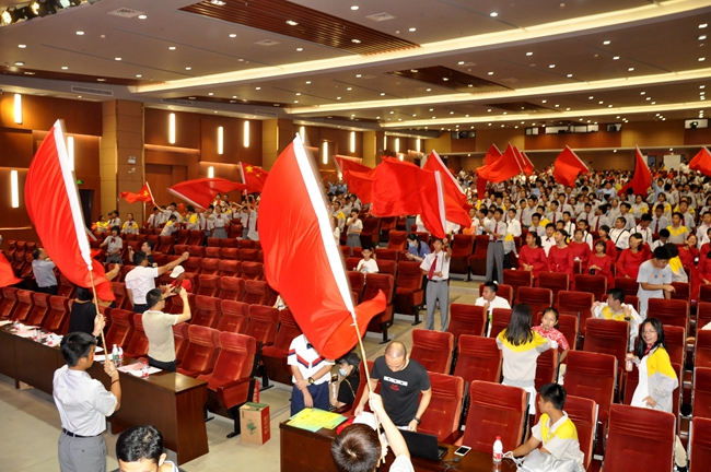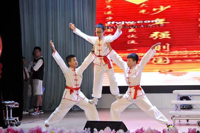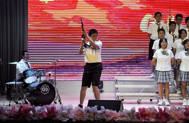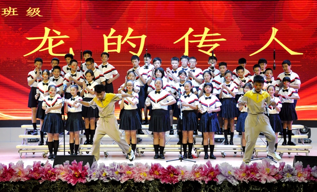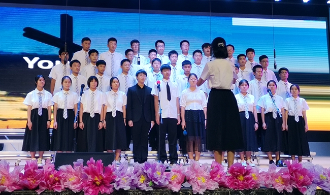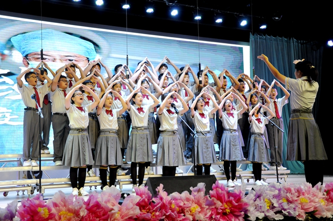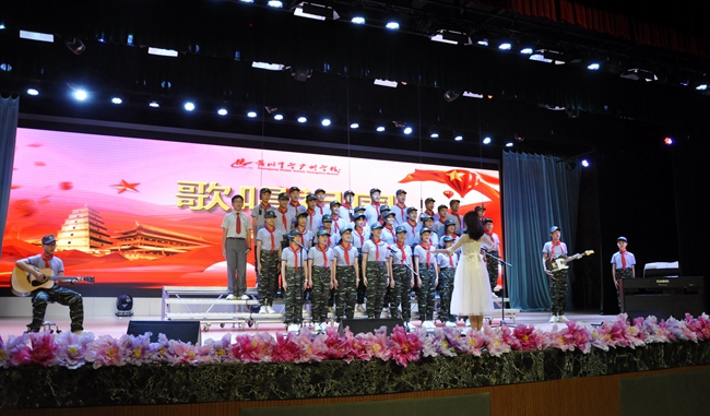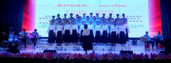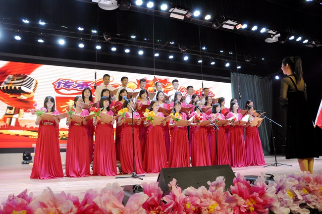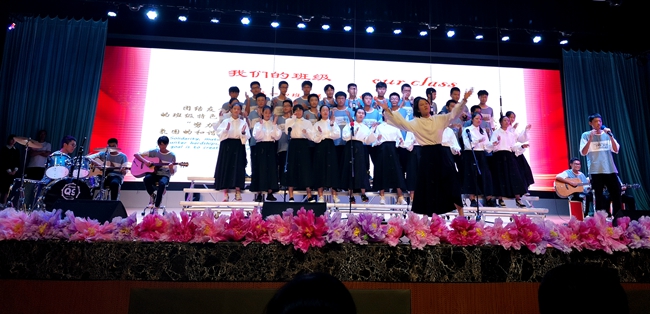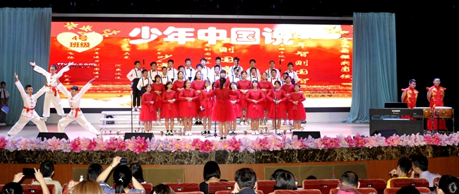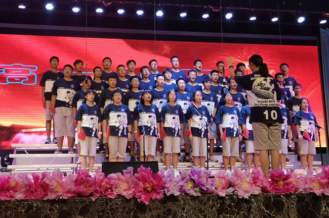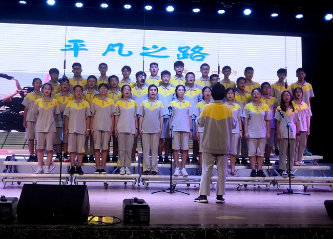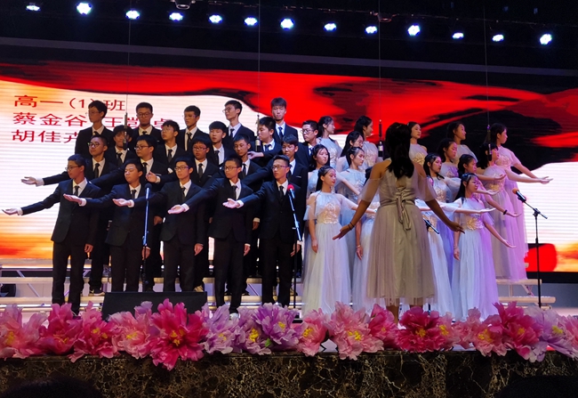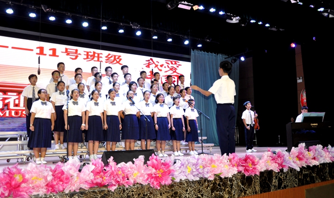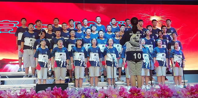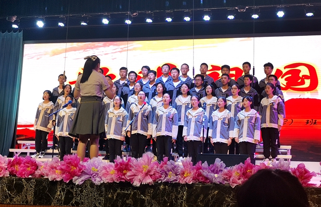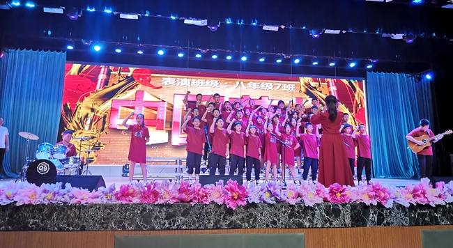 礼堂内,班级学生以歌声对决,力量奔腾的放歌与青春激扬的呐喊碰撞出耀眼璀璨的星火,为爱国主义情怀抹上了现代学子无所畏惧、拼搏奋勇的色彩;