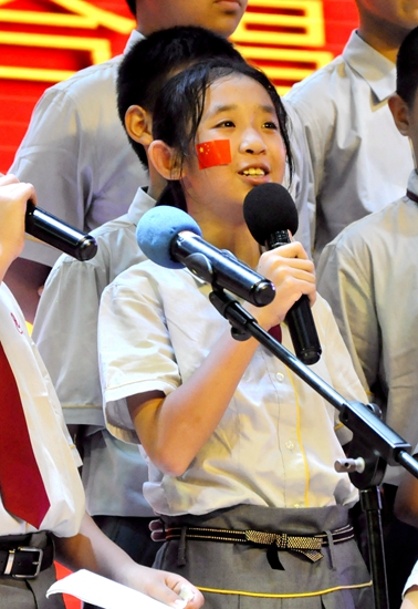五星红旗迎风飘扬,胜利歌声多么响亮,歌唱我们亲爱的祖国,从今走向繁荣富强……”