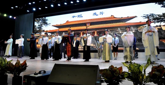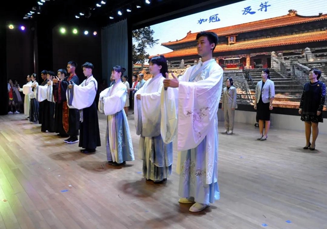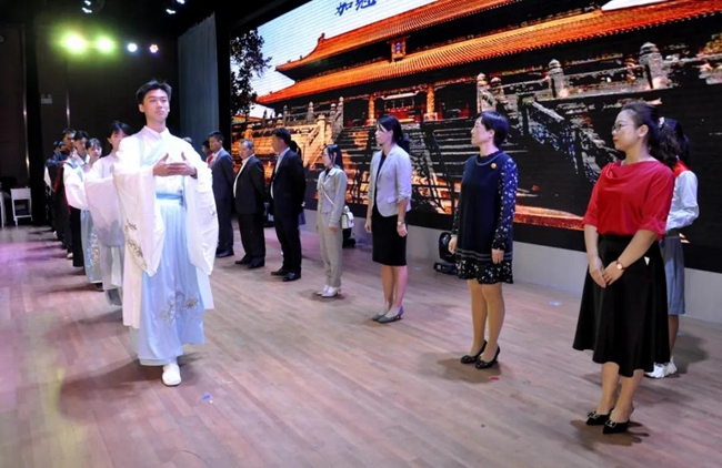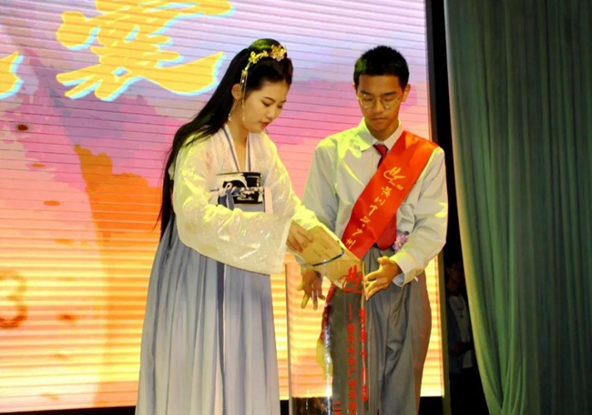“有请父母加冠及笄!凡人之所以为人者,礼义也。礼义之始,在于正容体,齐颜色,顺辞令,容体正,颜色齐,辞令顺,而后礼义备。以正君臣,亲父子,和长幼,而后礼义立。令月吉日,始于元服,弃尔幼字,顺尔成德!一拜,父母养育之恩;再拜,师者辛勤教导;三拜,同窗互助互爱。”