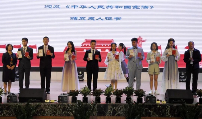 学校范小星校长、孙传华副校长为高三各班级学生代表颁发成人证书,赠送《中华人民共和国宪法》。