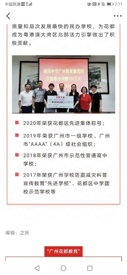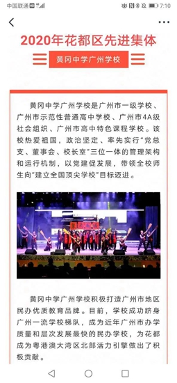 广州市黄广中学区民办优质教育品牌。目前,学校成功跻身广州一流学校梯队,成为近年广州市办学质量和层次发展最快的民办学校,为花都成为粤港澳大湾区北部活力引擎做出了积极贡献。