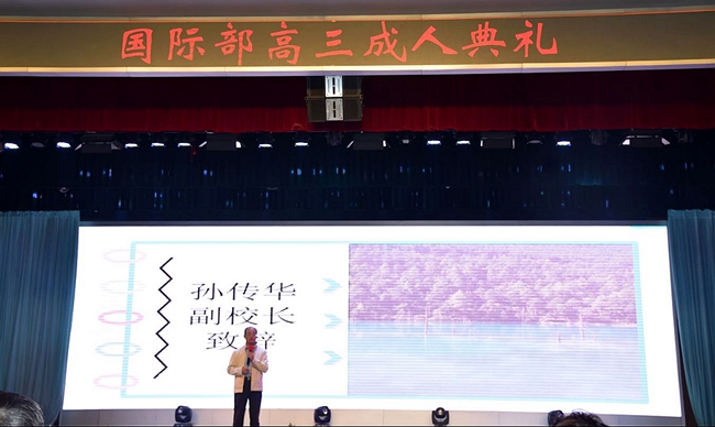 主管高中的孙传华副校长上台致辞,向国际高三学子讲述自身见证学生“长大成人”的真挚感受,也特别指出,大家能够平安健康地欢聚一堂、拥抱人生并展望未来,是全国人民同心协力抗击疫情的结果,勉励即将走出国门到海外求学的同学们要始终铭记“中国人,中国心”,肩负起成就自我、追寻梦想的使命,承担起父母家人乃至国家对下一代建设者&接班人的期望,化担当为成长动力,期待他日学成,共筑不一样的未来。
